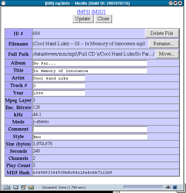 OK I realize this is a skank-nasty page, but at the moment I just want to release. This is a set of Perl scripts which interface with MySQL to provide streaming MP3's over the net. The package includes just about everything you'll need, such as sql scripts, shell scripts, Perl cgi and shell scripts, etc. Right now I'm not going to take the time to list everything, as it's pretty much all in the README.